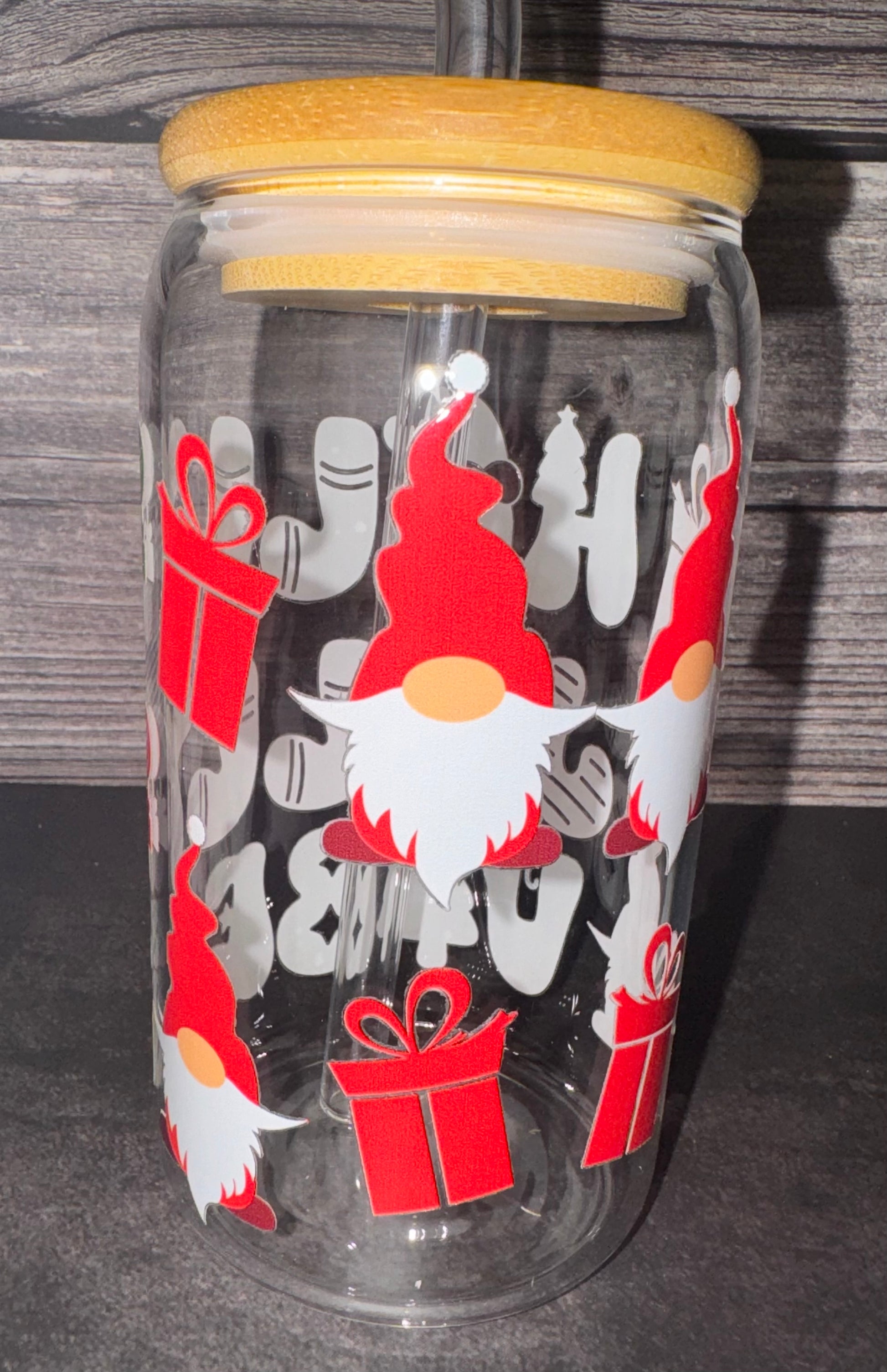 Holly Jolly Vibes 16oz Glass Cup with Bamboo Lid. Includes Glass Straw and Straw Cleaning Pipe.