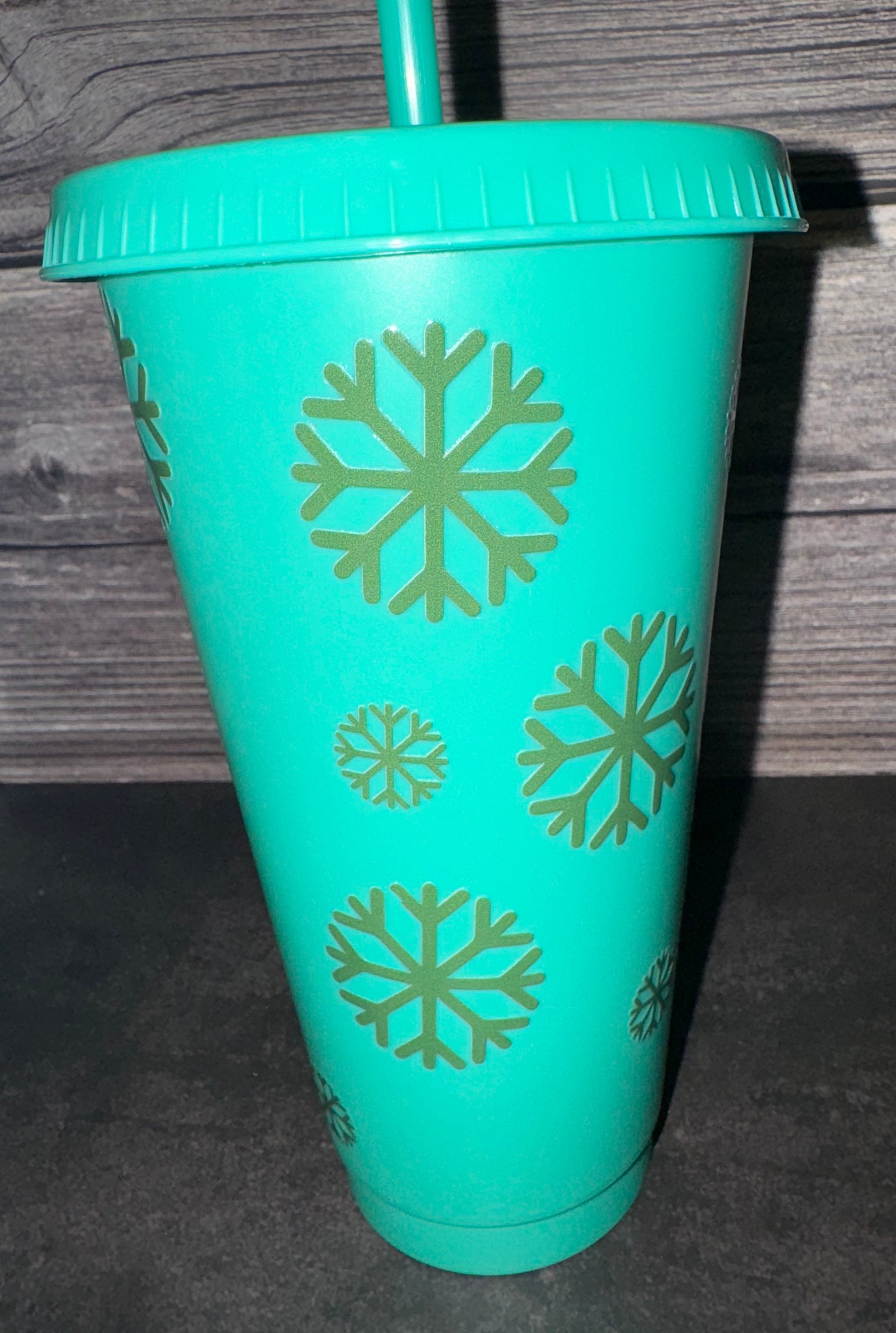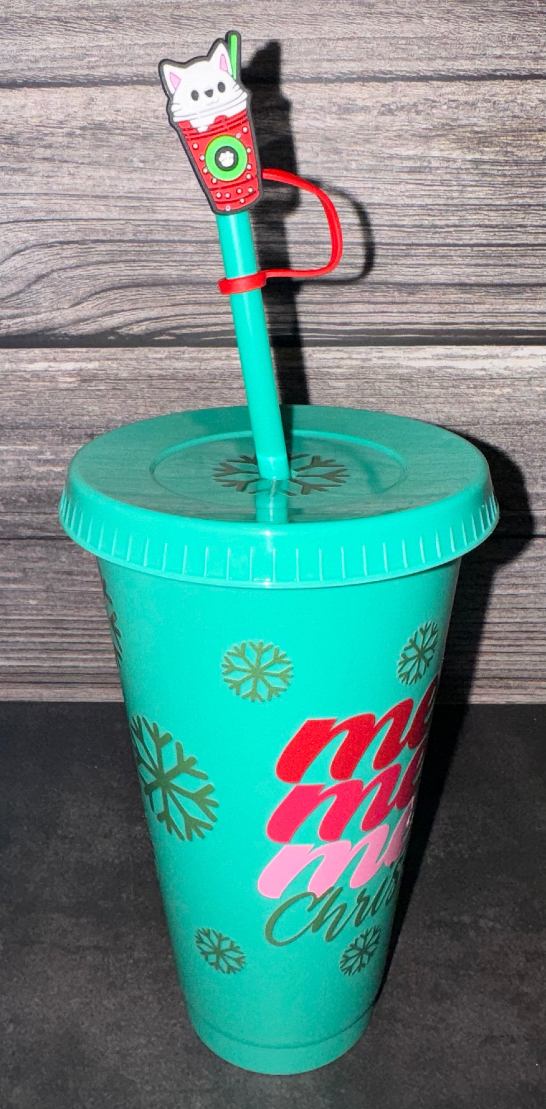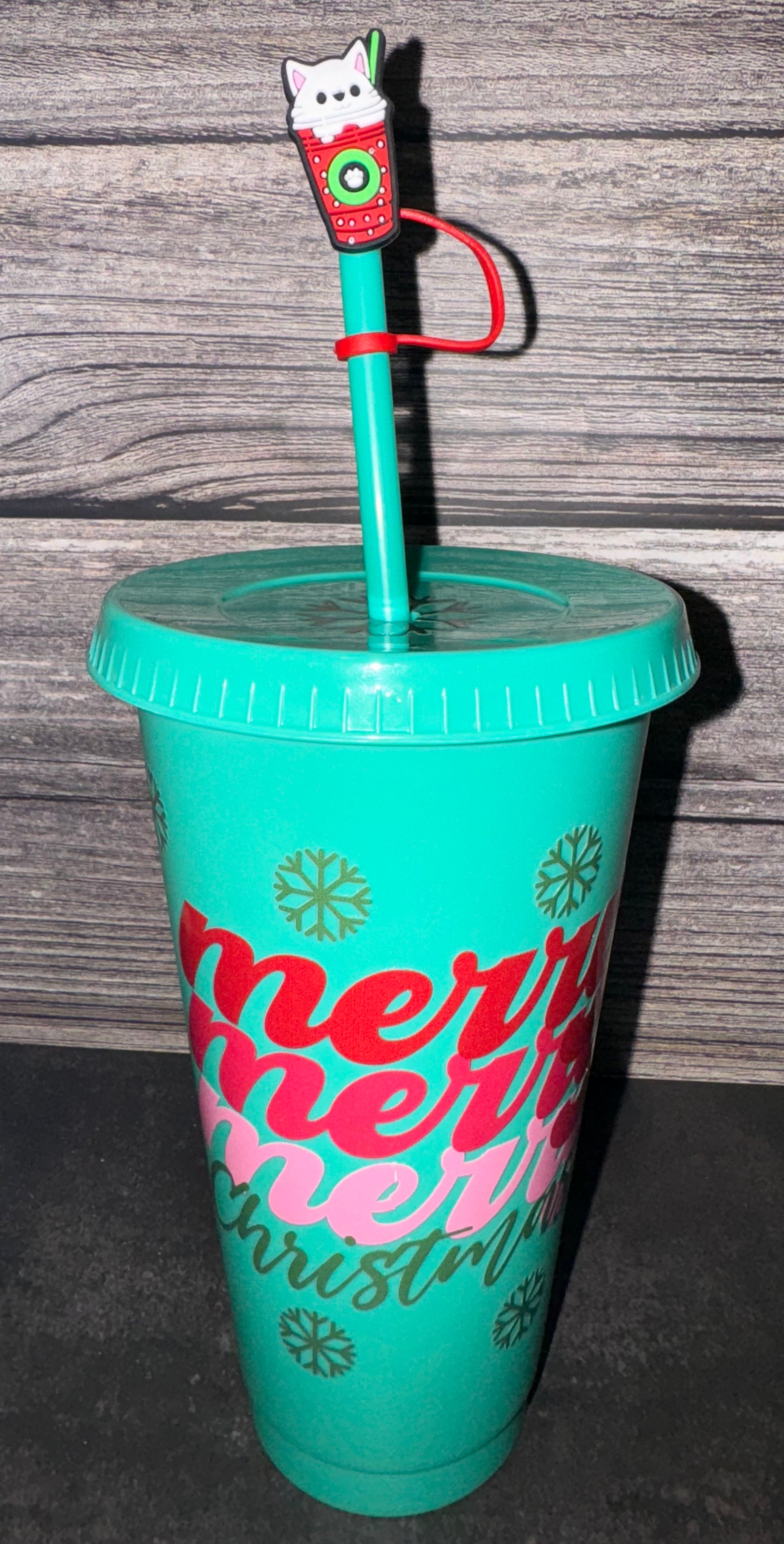 Green "Merry Merry Christmas" festive 24oz Tumbler Cup with Matching Plastic Lid and Straw. Straw Cap Cover is Included.