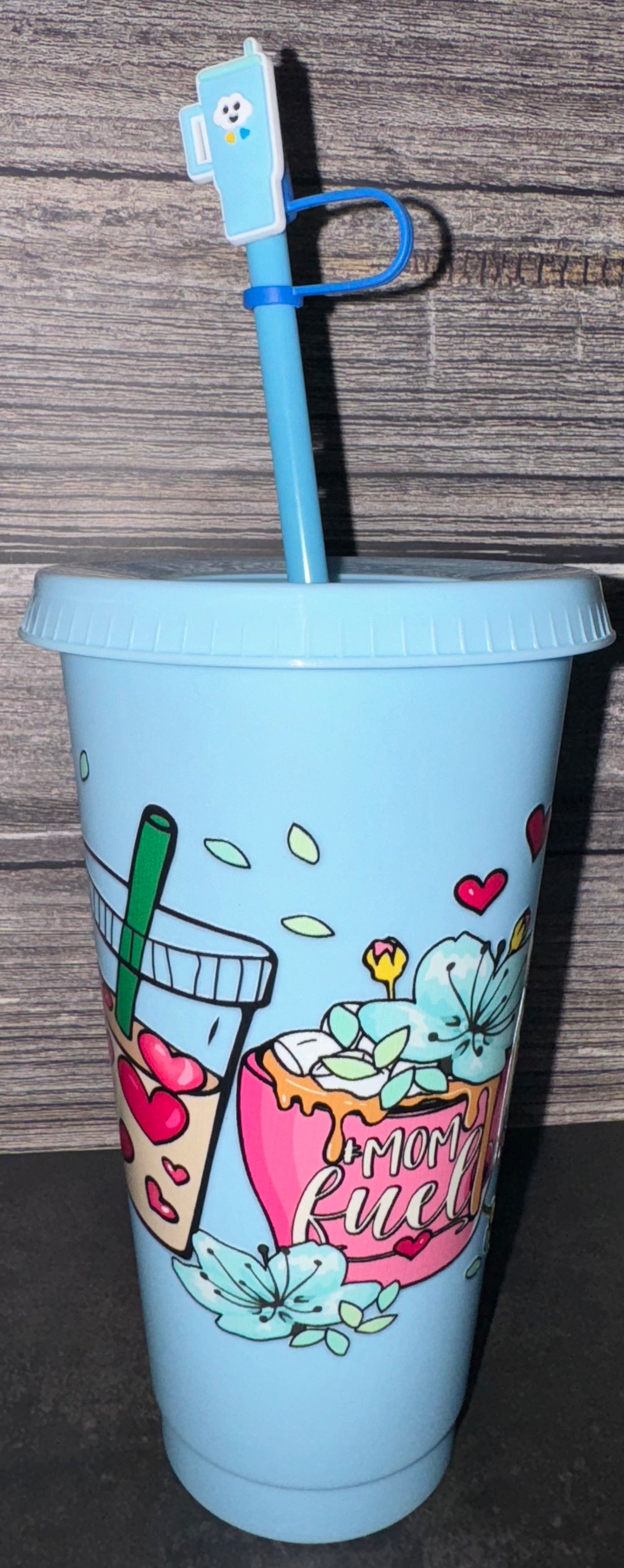 Light Blue "Mom Fuel" 24oz Tumbler Cup with Matching Plastic Lid and Straw. Straw Cap Cover is Included.